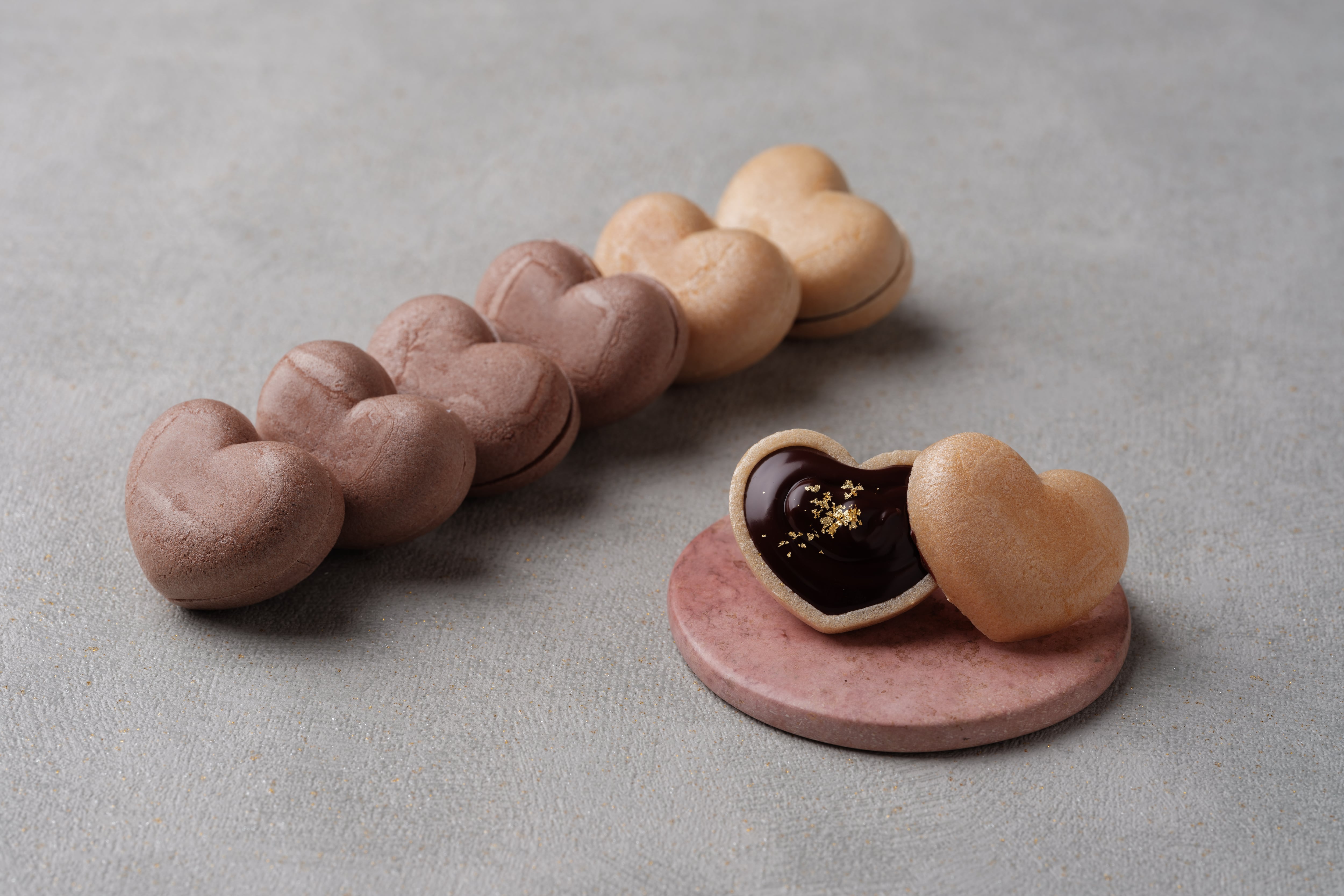 ハート型の最中に、ほろ苦く濃厚なビター生チョコレートをたっぷり詰めて、仕上げに金箔をふわりとあしらいました。
