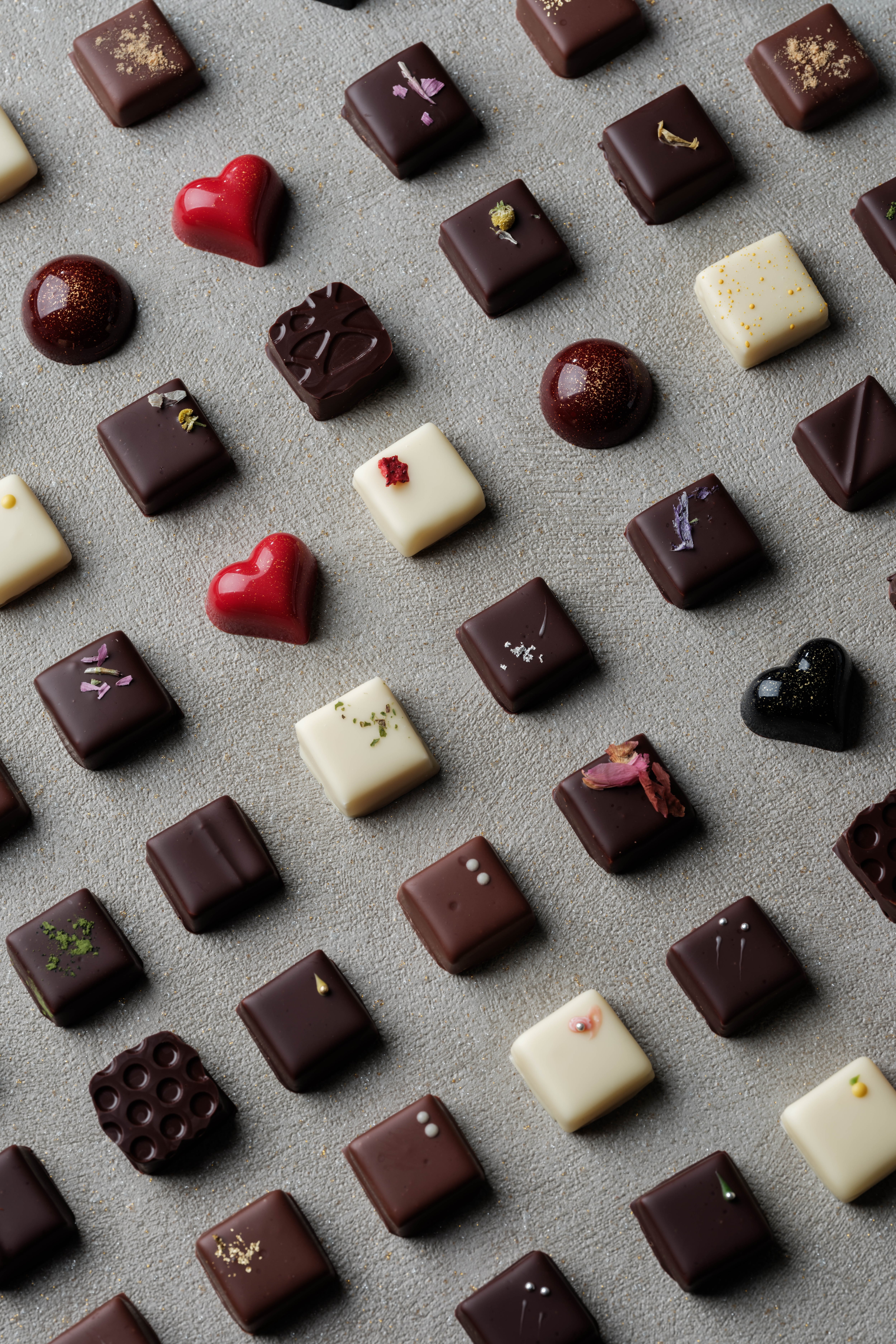 チョコレート(フランス製造・国内製造)、生クリーム、ほうじ茶抽出液(生クリーム・牛乳・ほうじ茶葉)、苺ピューレ、薩摩芋ペースト、蜜漬け能登大納言小豆、バター、柚子ピューレ、蜂蜜、転化糖、ココアバター、抹茶粉、芋けんぴ、食塩、きな粉 / 乳化剤(大豆由来)、着色料(赤40号、ベニバナ色素、金箔)